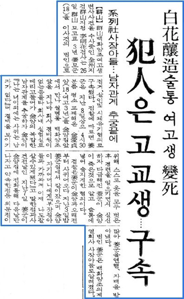 해당 사건은 1978년 4월8일에 전라북도 군산시의 백화양조의 계열사 사장의 아들인 강 모군(당시 18세)이 본인과 연인관계인던 김 모양(당시 18세)을 백화양조 실험실에서 살해한 사건이라고 합니다.