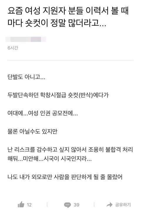 숏컷치면 일단 선입견 가지고, 여대라고 해도 선입견 가지고, 페미니즘 동아리나 여성인권 관련된 공모전에서 입상하거나 해도 거른다고 하고 진짜 남자들끼리 카르텔지키기 추잡하고 역겹네요ㅋㅋㅋㅋㅋ