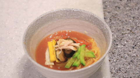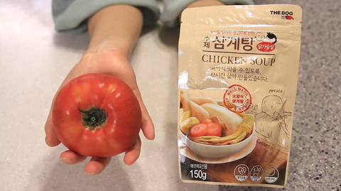 토마토와 삼계탕국물을 이용해서 라면 국물을 내주었어요!