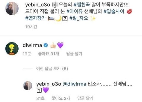 그 악플을 인식했는지 보란듯이 예빈이한테 댓글 남겨준거