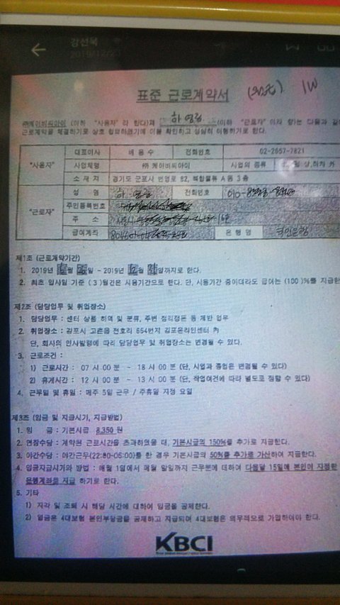 4번 사진 올리는 데 사진이 해킹당하는지 옆으로 도네요.중요한 부분은 근무시간이 수기로 된 부분과 타이핑 된 시간이 다른거고 더 중요한 건 전 그 타이핑 된시간은 제 근무시간이 아니라는 겁니다.그리고 더 중요한 건 그 계약서 교부 받은 적도 없습니다.