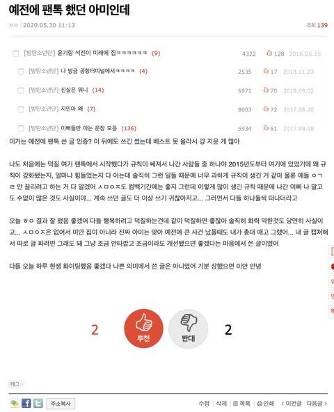 저쪽 ㅎㅇ 결과가 조금 실망스러웠는데 여기가 만들어져서 다행이야ㅠ 뭔가 예전 내가 좋아하던 팬톡 분위기가 돌아와서 좋다ㅠㅠ 떠났던 이삐들 다 다시 왔음 좋겠당