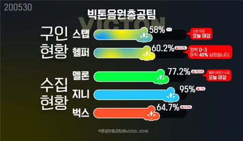 멜론 스탭 모집은 백프로 못 채웠는데 마감됐고 헬퍼 모집은 내일 마감인데 아직 40%남았어 모금도 컴백 3일 남았는데 이제 반 채웠고 앨범공구... 하울링때랑 차이가 많이 나네..