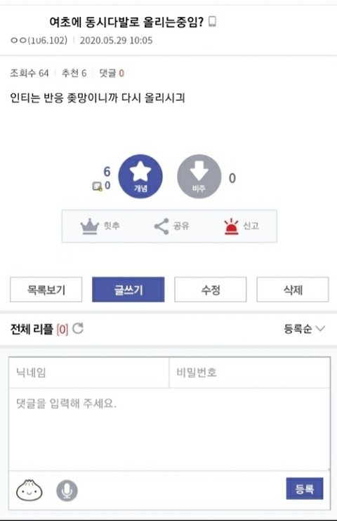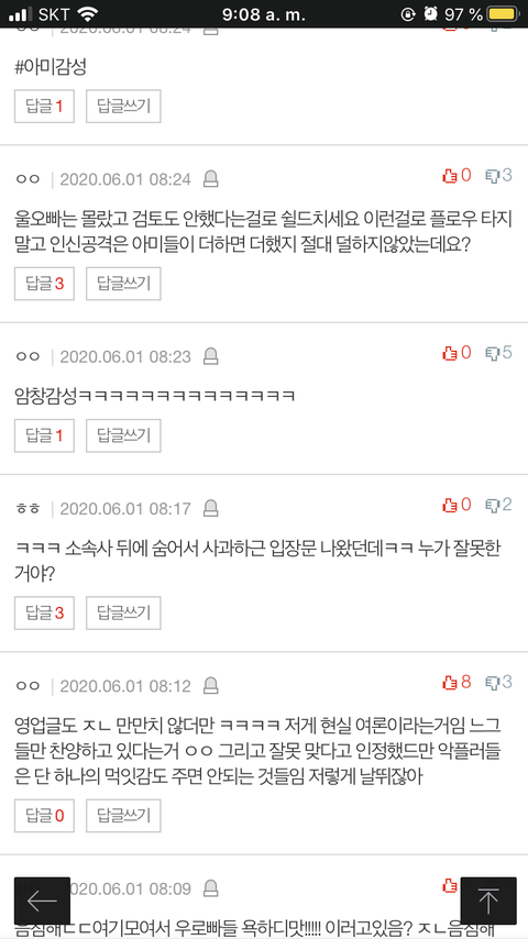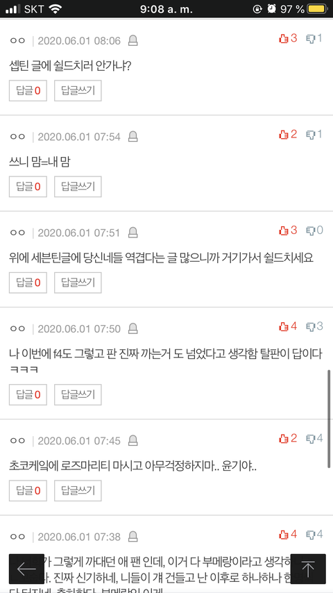 +댓글들아 나한테 쳐묻지 말라고 나 요새 엔터안봄ㅠㅠ 니네가 까글로 다 차지했늠데 뭘보라고ㅠ 개짜증나게ㅋㅋ 까는거에 정당한 이유 붙이려고 발악하는 꼴도 징그럽다