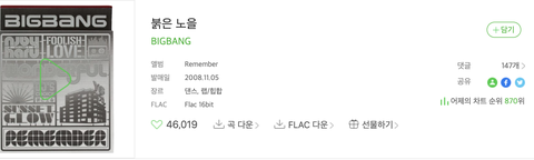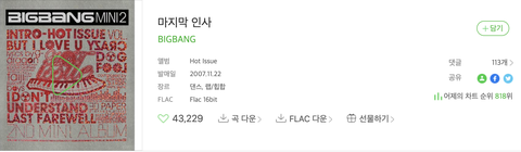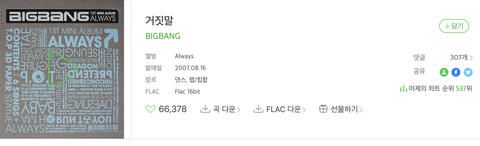 엄마가 거짓말 틀어보라고 해서 멜론 쳐봤는데ㅋㅋㅋㅋ13년된 순위가 537위ㅋㅋㅋㅋ난 거짓말이랑 하루하루가 13년동안 천위권 밖으로 나가본적이 없다는게 신기함. 게다가 거짓말은 지디가 20살떄 단독으로 작사작곡한 노래임. 지금 나이로는 2001년생임. 빅뱅 딱히 좋아해본적은 없는데 이건 좀 쩌네