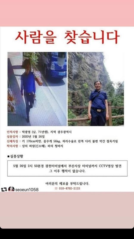 아래 사진의 인물을 보셨다면 부산경찰 실종팀 051-329-0338에 실종자 박강영씨를 봤다고 알려주세요.