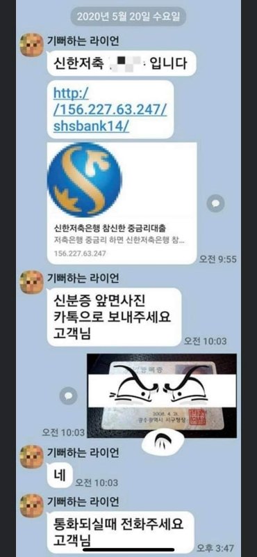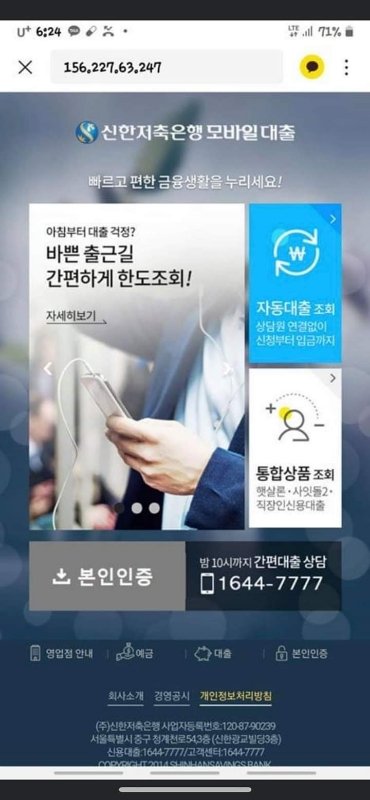 아버지 통장을보니 2천만원 넘게 4차례 사기꾼들에게 줬습니다. 아버지 카톡에는 신한저축은행이라면서 말도 안되는 URL이 적혀있고 실제 들어가면 가짜 신한저축은행 홈페이지가 보였습니다.