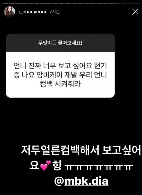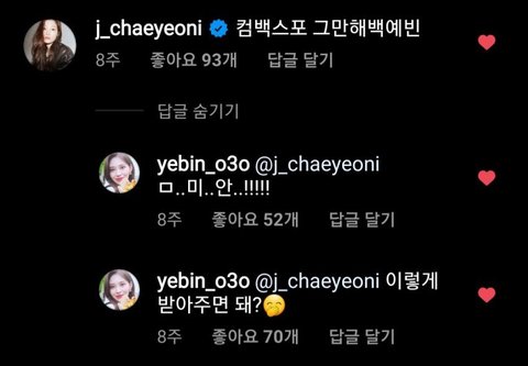 3월말 다이아 멤버 예빈 인스타에 채연이가 단 댓글