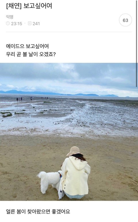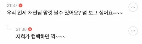 3월에 채연이가 공카에 글 쓰고 댓글들마다 답변해줬는데 그 답글 중 하나. 컴백하면 볼 수 있다고 함