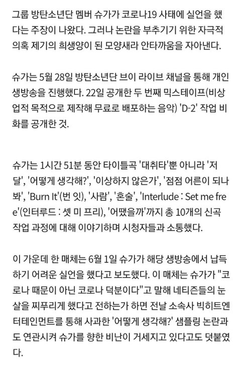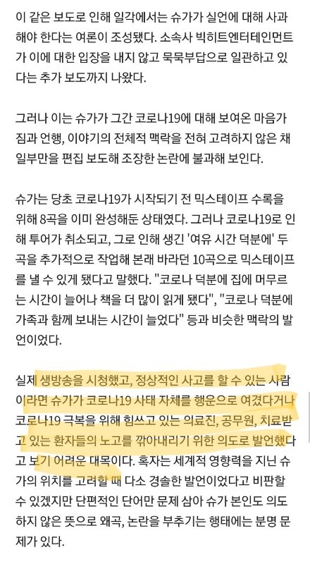 난 생각이 달라. ‘코로나 때문이 아니라 코로나 덕분’이라는 말을 굳이 왜 한 건지 모르겠어. 덕분이란건 은혜를 입었다는 뜻이잖아. 코로나로 인해, 코로나 때문에 시간이 많아져서, 이렇게 말하면 아무 논란 없었을걸? 믹스테입은 개인적인 성취고 기쁨인데 그게 공적으로 알려졌을때 남들에게 거리낌이 있을수 있는건 당연한거지... 그리고 ‘코로나가 가져다준 행운’이란 것도 이해가 안가. 마스크 업체 사장이 코로나로 떼돈 벌었어도 사회 분위기를 의식한다면 저런 표현 못쓰지 않을까? 나한테 행운을 가져다준 코로나, 라는 의미가 얼마나 부적절할지 생각해봐. 방탄이 끼치는 영향력에 대해 인식 좀 했으면 좋겠어.