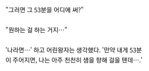 어린왕자가 먹으면 일주일동안 목 마르지 않는 알약을 파는 상인을 만나거든? 그래서 그걸 왜 파냐고 물으니 시간을 절약하기 위해 판다며 총 일주일에 53분을 절약할 수 있다고 답 하거든? 어린왕자는 그걸 듣고 나라면 53분으로 샘으로 걸어가겠다고 대답해..(참고로 이거에 대한 해석을 찾아보니 샘은 단순히 물을 먹기 위한 샘 뿐만아니라 여유로움 희망 사랑 등등 포괄적 으로 해석 되더라고)
