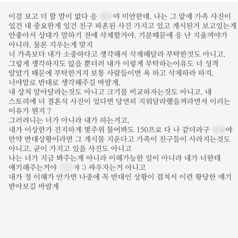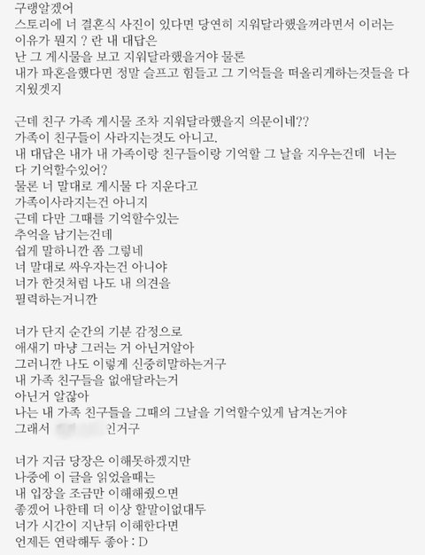 다른 주위 친구들은 알아서 지워준 친구도 있어 너무 고마웠구요. 그래서 그 친구한테 부탁했는데 앞뒤로 제 결혼식 사진 뿐 아니라 가족이랑 찍은 사진 친구들이랑 단체 찍은사진(제 결혼식과 무관한 개인적 사진들, 몇장중 제 결혼식 사진이 두장가량 껴있었고요) 있다고 지우지 못하겠다고 하더라고요