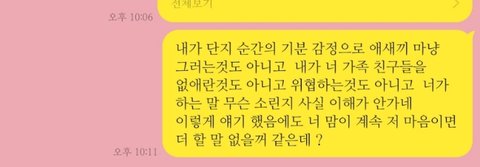 마지막에 이해한다면 언제든지 연락해라는말 소름... 대인배인척 합리적인척 쩐다 .... 완전 공감능력결여 ㄷ라이같음