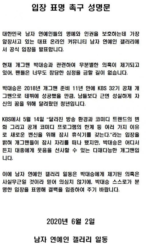 이어 "박대승은 2018년 개그맨 준비 11년 만에 KBS 32기 공채 개그맨으로 데뷔에 성공했을 만큼 남들보다 근면 성실하게 자신의 꿈을 위해 달려왔던 청년"이라며 "KBS에서 5월14일 달라진 방송 환경과 코미디 트렌드의 변화 그리고 공개 코미디 프로그램의 한계 등 여러 가지 이유로 새로운 변신을 위해 잠시 휴식기를 갖는다고 입장을 밝혀 개그맨들이 잠시 자리를 떠나게 됐지만 박대승은 어디서든지 대중에게 웃음을 선사할 수 있는 다재다능한 개그맨"이라고 강조했다. 그러면서 "남자 연예인 갤러리 일동은 박대승에게 제기된 의혹은 사실무근일 것이라 믿어 의심치 않기에 박대승 스스로가 분명한 입장을 표명해 결백을 입증해 달라"고 요구했다.