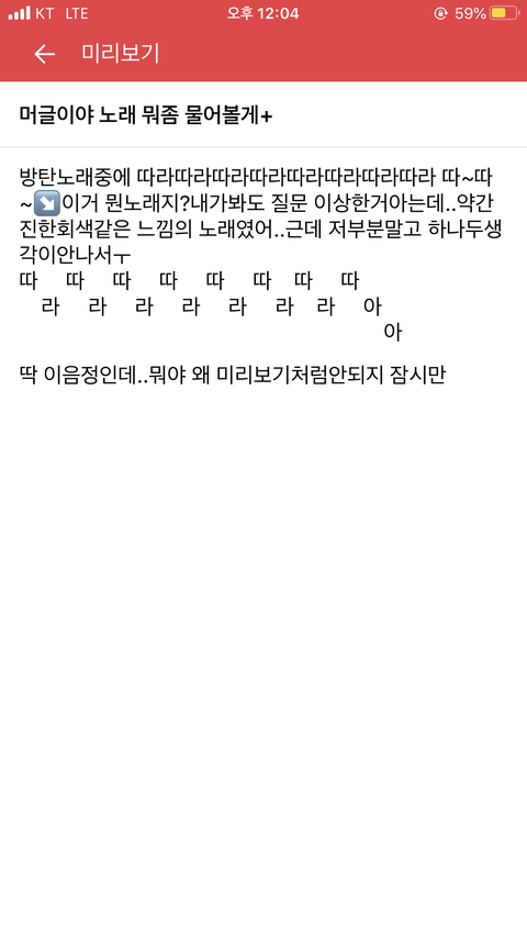방탄노래중에 따라따라따라따라따라따라따라따라 따~따~↘️이거 뭔노래지?내가봐도 질문 이상한거아는데..약간 진한회색같은 느낌의 노래였어..근데 저부분말고 하나두생각이안나서ㅜ
