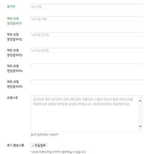 2. '신고' -> '비정상적으로 생성된 검색어로 의심되는 경우' -> 여기서 한번씩만 제외 요청 써주라 ㅠㅠ 난 요청 사유 이렇게 썼어!