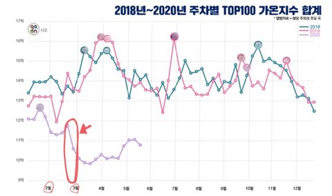 그리고 탑 백 가온지수 합계 그래표이고 보라색이 2020년이야 보다시피 연초부터 작년과 제작년 초에 비해 지수가 낮았는데 2월 말부터 코로나가 심각해지면서 가온지수가 뚝 떨어졌고 하필 ON이 2월 말에 나와서 ㅠㅠㅠ 아무래도 차트에 있으면 머글픽 (가게&음식점 등)을 받을 확률이 큰데 저때는 많이들 문을 닫아버렸으니 그 마저도 받기 어려웠고 게다가 가온지수는 아직까지도 복구가 안되고 있어 한마디로 우리나라 모든 음싸 이용률이 전체적으로 낮아졌다는건데 이정도면 스4티파이나 사과뮤직 처럼 가온 지수에 집계가 안 되는 외국음싸로 사람들이 많이 갈아탄게 아닌가 싶을정도야