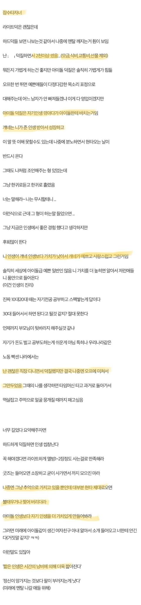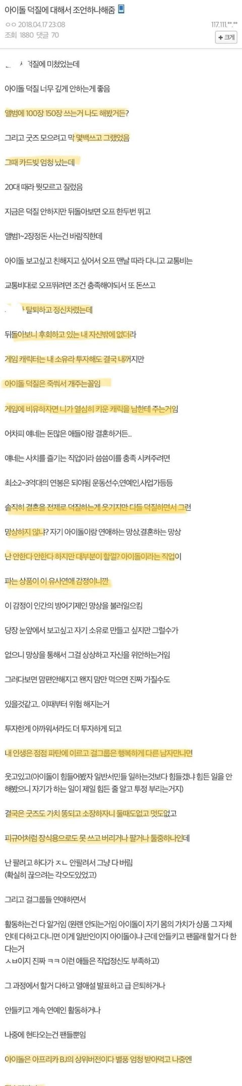 글에서 티난다 왜저렇게 덕질에 돈을 쏟아부었는지..ㅋㅋ 난 내인생이 내돌 인생보다 가치 낮다고 생각한적도 없는데 ㅅㅂㅋㅋㅋ 다 본인같은줄 아나봐..? 결혼ㅇㅈㄹ (내눈엔) 잘생기고 능력있어보이니 설렐때도 있지만 최애랑 뭐 어떻게 해보겠다 이런건 전혀 아님; 갑자기 걸그룹 얘긴 또 왜해ㅋㅋ 난 내 인생에서 덕질하는게 전혀 시간낭비라고 생각 안함 덕질하면서 행복 느끼고 문화생활하고 여러 경험들도 할 수 있었고 없는 돈 쳐바른것도 아니니까 아깝지도 않아 저사람은 대체 누구를 어떻게 덕질했길래 저러냐.. 나중에 후회하냐 마냐는 본인한테 달린거임 ㅇㅇ 난 후회안함