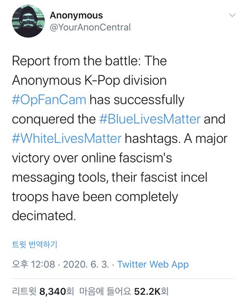 그 결과 결국 #whitelivesmatter 해시태그에는 인종차별주의적인 트윗내용 대신 kpop fancam들이 주구장창 올라오고 인종차별트윗은 저 아래로 묻힘 +스팸처리