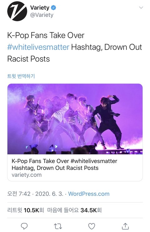 근데 이걸 본 kpop팬들이 일부로 #whitelivesmatter 요 해시태그에 팬캠들을 올려서, 일부로 레이시스트들의 인종차별주의 적인 트윗을 보이지 않게 하려고 일명 배틀아닌 배틀 또는 총공 아닌 총공을 실시함ㅋㅋㅋㅋㅋ