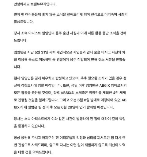 AB6IX 임영민 음주운전 면허취소,활동중단