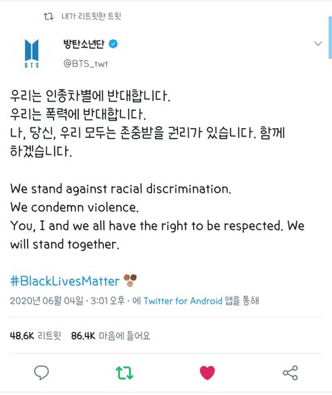 흑인차별이 아닌 모든 인종차별 에 반대. 그리고 모든 폭력 에 반대. 글 정말 깔끔하게 잘썼어 어디에도 치우치지 않고 할말 다하고 진심 명문이다.. 마지막 문장도 예전부터 해오던 얘기였어ㅠ 사랑하고 고맙고 자랑스러워 내가수