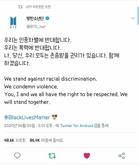 지금 전세계적으로 흑인인권운동이 이슈지만 한인 피해문제때문에 다들 약간 지지하기도 애매하고 별로 시큰둥했는데 아예 폭력자체를 반대하고 '모든 인종의 인권'이 존중받아야 한다고 올려서 양측 가려운 곳을 다 긁어줬네....글 되게 잘썼음 영어로도 오해 소지없게 깔끔하게 썼네
