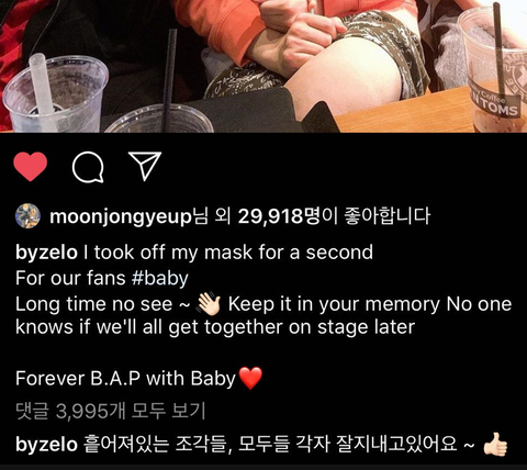 막내 젤로가 어제 인스타그램에 올린 사진+글인데 대현이랑 종업이랑 셋이 만났더라구!! 여기서 포인트는 젤로가 처음에 "keep it in your memory No one knows if we'll all get together on stage later" 이라는 문장을 안적고 올렸다가 후에 수정해서 저 문장을 추가한거야!!!!!!