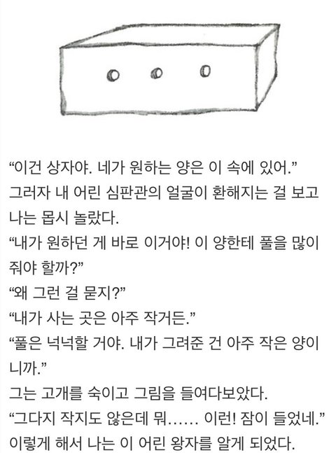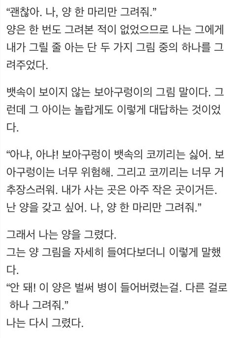 + 이건 내 생각인데 슙디에서 동화읽어줄때 어린왕자 그림그려달라는 이 부분 읽어주면 진짜 대단한거 아니냐 이 부분 읽어주고
