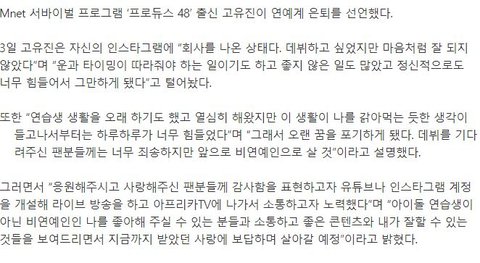 Mnet 서바이벌 프로그램 ‘프로듀스 48’ 출신 고유진이 연예계 은퇴를 선언했다.