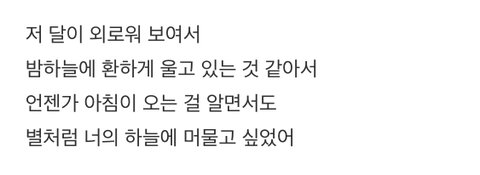 달(아미)에게 밤하늘(외로움, 슬픔)에 별처럼 되고 싶다고 했잖아. 뭔가 내가 네 아침이 되어줄게 가 아니라 네 밤에 같이 있어줄게 라고 말하면서 아침이 올까 두려워하는 느낌? 왜냐면 별로 곁에 있어줄 수 있는 시간은 밤뿐이니까 그래서 난 좀 신기했어 정국이가 평소에 팬들한테 말할때도 자신을 좀 낮추면서 말하는 느낌이라서 뭔가 되게 정국이스러운 가사라고 생각했어. 그리고 또 유포리아 가사에서는 ‘너는 내 삶에 다시 뜬 햇빛’이라는 가사도 생각나더라. 이삐들은 어떤 느낌이었어?