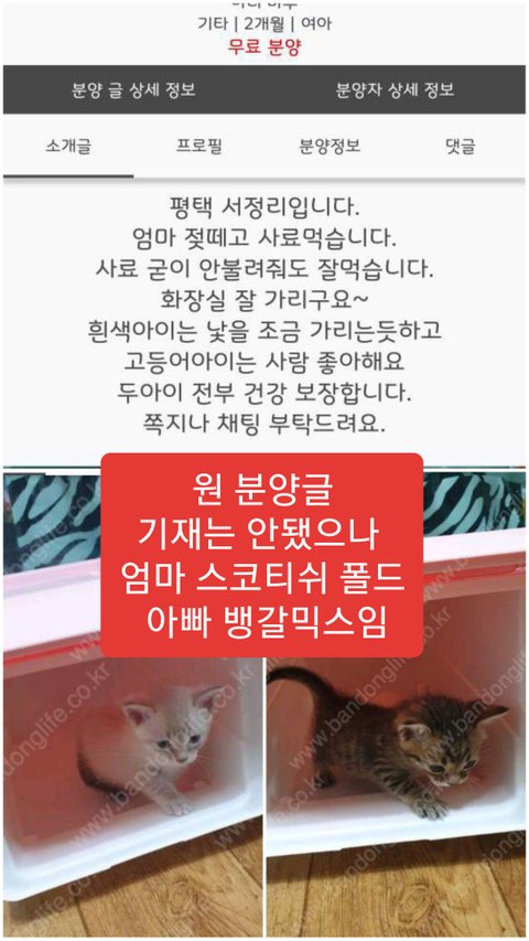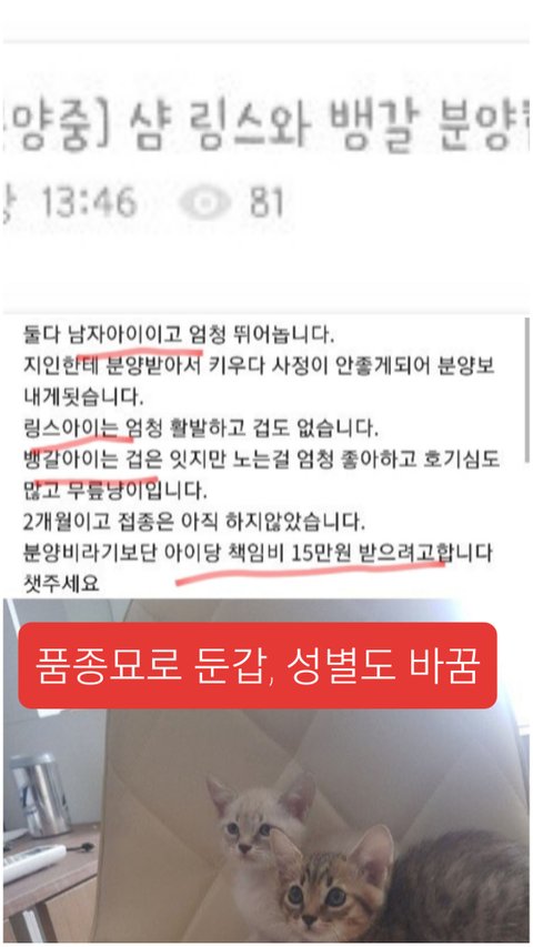 ㅇ 구조된 길냥이도 무료분양받아 품종묘 믹스라로 속여 책임비 받고 팜.