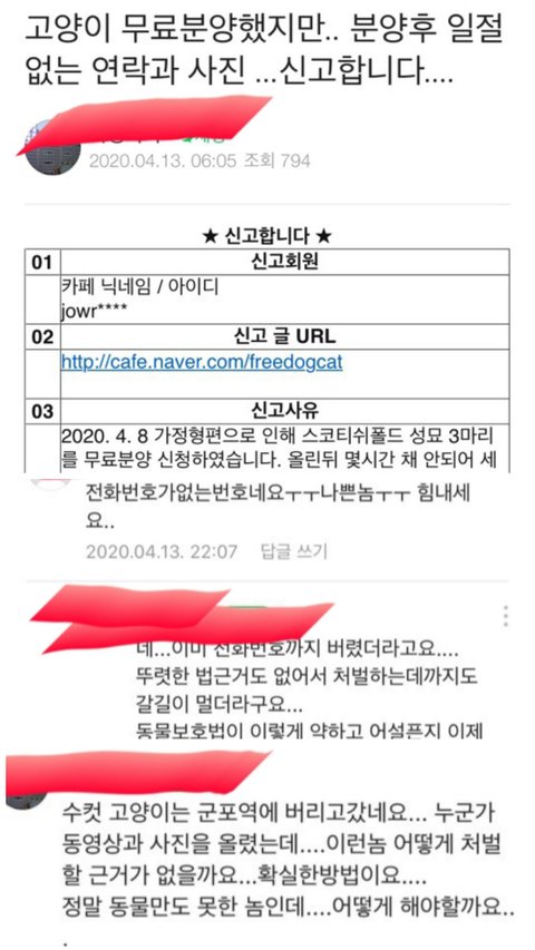 이들은 반려동물을 무료분양하려는 사람에게 자신의 조건을 속여 잘 키울 수 있다고 어필하여 데려와, 원룸에 다른 동물들과 방치하다, 저같은 사람들에게 품종도 성별도 속여 책임비를 받고 팔고 있었습니다. 적응 잘 하길 바라는 마음에 함께 보낸 용품들은 중고로 팔구요.