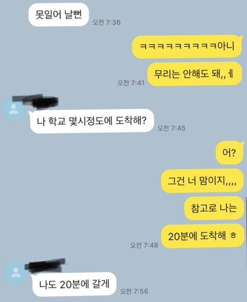 일단 고1임;; 나 공부한다고 고닥교 좀 멀리 와서 아는 애들 진심 없엇는데 울반에 어떤 남자애도 없었나봐 그래서 어제 말 한번 걸고 카톡 좀 하면서 친해졌는데 내가 셔틀 타고 다녀서 학교를 8시 20분쯤 좀 일찍 도착하거든? 그래서 어제 저녁에 카톡하다가 장난으로 일찍 오라 그랬는데 오늘 ㄹㅇ 20분에 오고 막 얘기도 많이 하고 그랬어