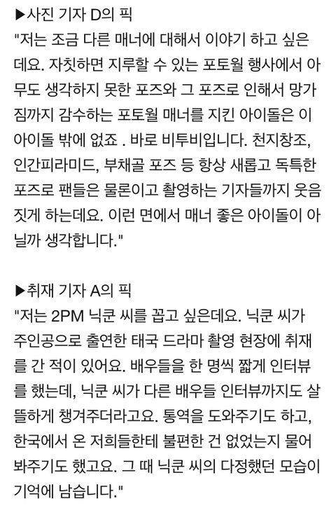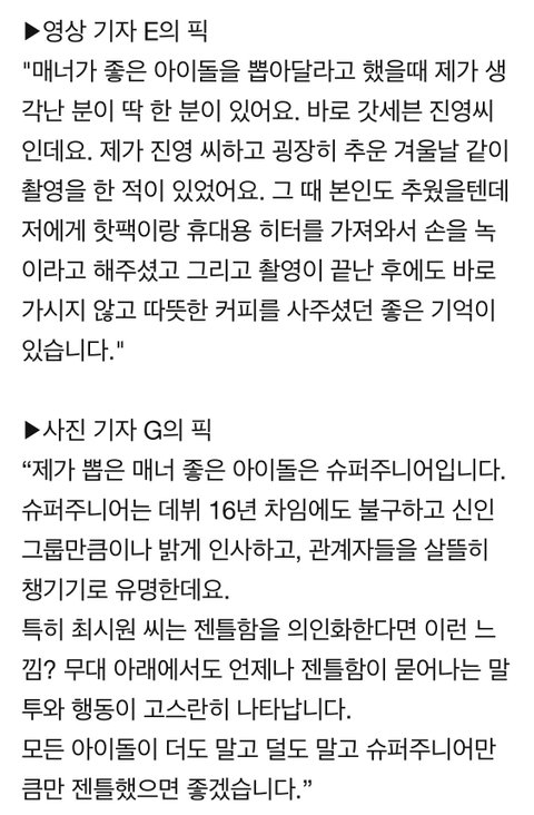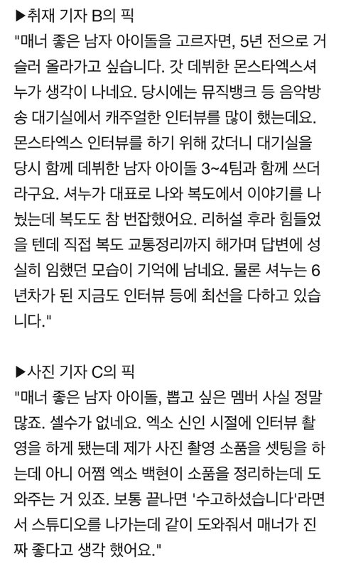몬스타엑스 셔누, 엑소 백현, 비투비, 2PM 닉쿤, 갓세븐 진영, 슈퍼주니어 많은 아이돌을 만나봤을 텐데 이렇게 뽑을 정도면 진짜 매너 좋은 듯