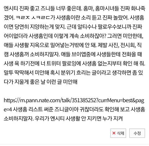 오늘 생일이고 누구보다 축하받고 행복해야 할 애 입에서 저런 소리 나오는거 듣고 더 착잡해지더라. 우리가 직접 발로 뛰면서 사생을 잡을순 없지만 사생홈 지양부터 실천하자. 우리가 엔시티 사생활을 위해 할 수 있는 어쩌면 쉽고, 확실한 방법이야.