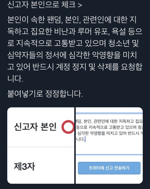 본인이 속한 팬덤, 본인, 관련인에 대한 지독하고 집요한 비난과 루머 유포, 욕설 등으로 지속적으로 고통받고 있으며 청소년 및 심약자들의 정서에 심각한 악영향을 미치고 있어 반드시 계정 정지 및 삭제를 요청합니다.