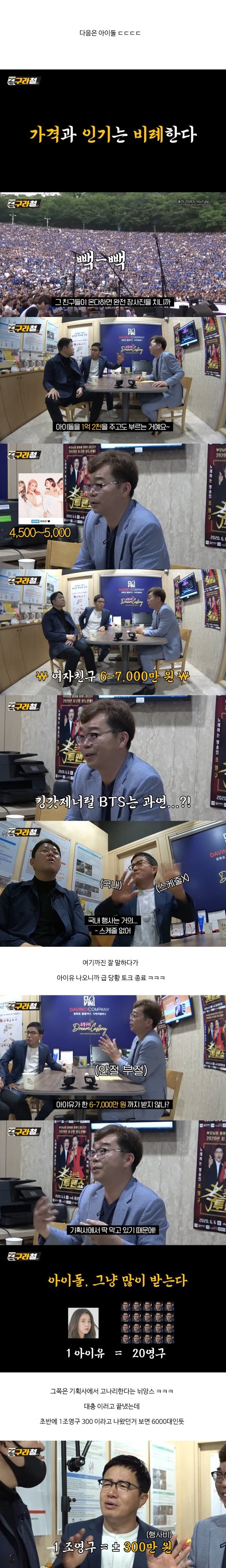 저거 다봤는데 ㅋㅋㅋㅋ 행사 관련 에이전시? 대표같은 사람이 같이 토크하는건데... 트로트쪽은 쉽게말하면서 아이돌쪽은 얘기하다 아이유얘기나오고부터 발뺌 ㅋㅋㅋㅋ 말하다가 아차 싶었는짘ㅋㅋㅋㅋ 그냥 얼버무리고 다많이받는다로 퉁침 ㅋㅋㅋㅋㅋ 업계비밀보장 이런거 있는듯 ㅋㅋㅋ