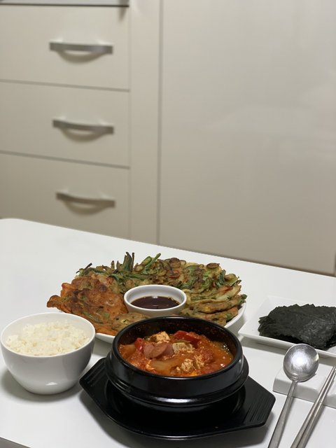 얼큰하게 끓인 참치김치찌개랑 전!!
