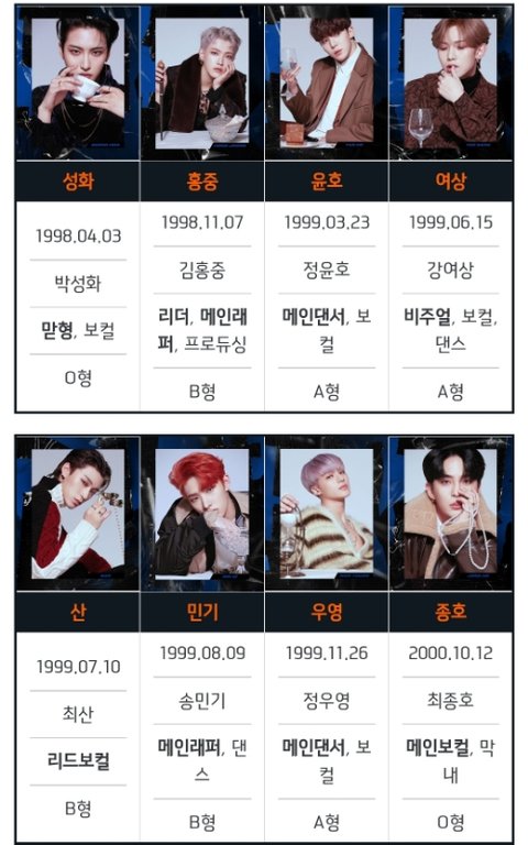 먼저 리더 홍중!!! 안양출신이고 kq 첫 연습생이야 홍중이가 블락비를 너무 좋아해서 자기가 직접만든 곡을 kq에 편지로 무작정 보냈는데 그걸 kq가 이사할 때 발견해서 홍중이한테 연락해서 아직도 음악하냐고 하고 홍중이가 첫 연습생이 됐어!! 리더답게 리더십도 뛰어나고 성격도 워낙 착해 그리고 작사, 작곡, 편곡 다 가능해!! 작사는 민기라는 멤버랑 같이 다 참여하고 있고 작곡한 노래는 지평선, sunrise, 오로라, From(데뷔 전이라 음원 없음) 등이 있어 편곡은 공식너튜브채널에서 커버 바이 홍중으로 편곡해서 커버하고 있어 멤버들과 케미는 다 좋은데 특히 성화라는 멤버랑 더 좋은 것 같아(맏즈) 그리고 리폼도 해 옷 타이다이도 하고 신발도 리폼하고 진짜 잘해ㅠ