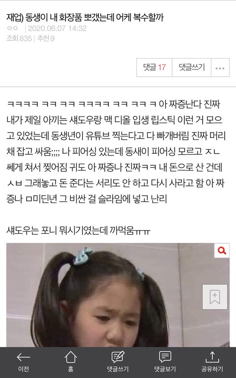 화장품 뽀갠 날이 어제였어! 동생 샤워 느긋하게 해서 1시간 좀 안 되게 하거든 오늘 샤워 하러 갈 때 걔 폰에서 영상 싸그리 삭제하고 유튜브 탈퇴 시킬려고 했는데 안 되길래 영상 올린 것들 싸그리 삭제 함ㅋㅋ 구독자 300몇 명 정도고 조회수도 꽤 있던데 다 삭제 했음ㅋㅋㅋㅋㅋ; 그리고 갤러리에 있는 사진들도 싹 삭제 하고 네이버 클라우드? 그거 있길래 거기에 있는 사진들도 삭제 할려다가 말음ㅋㅋㅌㅋㅋㅋ 그리고 슬라임들 큰 통에 다 모아서 섞이게 해놓고 우리 집 장독대 사이에 숨겨놓음 말리는 건 나중에 할게!! 그리고 동생도 맥 있단 말야ㅋㅋㅋ 맥이랑 동생이 아끼는 하이라이터 있는데 그거랑 쿠션이랑 아이브로우랑 등등 기초 제품 빼고 다 숨겨 놓음ㅋㅋㅋ 그리고 맥이랑 하이라이터는 빠개서 슬라임 섞어 논 거에 그대로 넣어줌^^_^ 오늘은 이거 밖에 안 했어ㅋㅋㅋㅋ!! 이정도여도 난 만족하고 덩생이 조카 욕 하면서 나한테 뭐라 하고 걔가 내 뺨 씨게 갈겼거든 근데 나 유도 1년 정도 배우고 태권도 초딩 때 다니고 지금은 복싱 다니는데 맞자 마자 3초 정도 얼 타다가 정신 차리고 동생 조카 팸..ㅋㅋㅋㅋ 엄마한테 때린 거만 혼났긴 했는데 후련하다^^ 돈은 끝까지 안 돌려주겠대