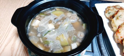 된장이랑 두부 호박 버섯 양파 오만둥이 1키로를 넣고 푹 끓였더니