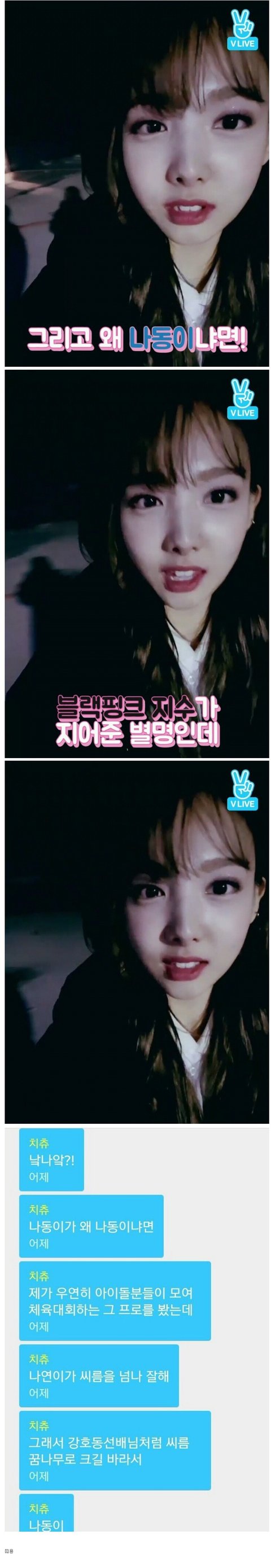 - 닉네임 짓기 좋아하는 지수가 씨름 잘하는 나연이를 위해 (나연+강호동) 나동이란 닉 지어줌ㅋㅋㅋㅋ