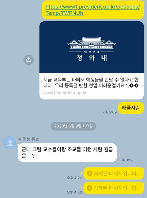 그래서 우리 대학 뿐만 아니라 온 대학들이 등록금을 일부라도 반환해달라고 외치고 있고 학생들을 모아 교육부에 항의도 해봤는데 바쁘다는 핑계로 만나주지를 않는 상황이야