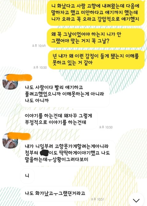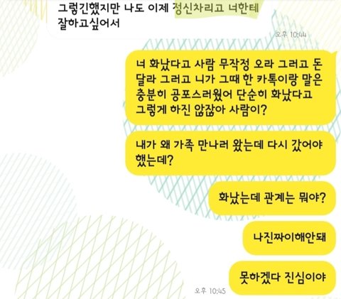 참은 게 누군데 자기가 다 받아주지 않았냐 얼마나 더 받아줘야하냐느니 어제 전화로 잘 풀지 않았냐느니.