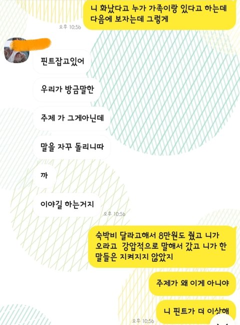 이 남자애는 그 뒤로도 얘기하자고 숙박잡아서 편하게 얘기하자 8만원 달라고 한번 더 말을 꺼냈다. 내가 괜히 느꼈던 촉이 아니었던 거다. 돈을 한번 준 뒤로 또 달라고 하는 남자애. 나는 미쳤냐고 했다.
