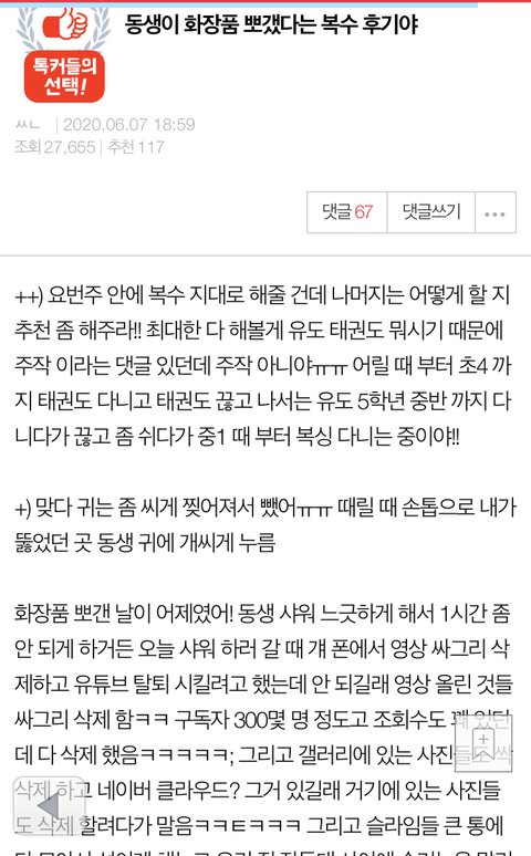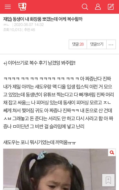 암튼!! 후기를 써볼게ㅋㅋㅋ 일단 동생은 중1이고 나는 고1이야 아무튼 저번에 그 일 있고 나서 동생은 울고불고 난리 나고 화장품 물어내라는 둥 달라는 둥 계속 아프다고 찡찡대고 그리서 내가 너 하는 거 보고 생각 해 볼게 이러고 우리 학교 사물함에 놓고 안 돌려줬어ㅋㅋㅋ 그리고 슬라임은 동생이 장독대 옆에 숨겨 놓은 거 찾아냈는데 땡볕이라 그런지 슬라임 다 녹았더라ㅋㅋㅋㅋㅋㅋㅋㅋ 그래서 동생이 이거 어쩔거냐고 뭐라 하길래 내가 좀 사납게? 생긴 상이거든 그래서 정색 하면 좀 무섭게 생겼다고 들었는데 그거 생각나서 갑자기 정색 하면서 뭐 어쩌라고 이러고 집 계단 올라가는데 동생이 그 슬라임들 빡쳐서 마당에 다 부은 거야 그래서 내가 놀라서 돌았냐고 뭐라 하다가 우리 엄마가 이때까지 있던 일들 다 알거든ㅋㅋㅋ 그래서 엄마 데리고 가서 왜 부었는지 엄마한테 설명 했는데 엄마가 동생 귀 잡아땡기고 집 안으로 가면서 나보고 이거 좀 치워달라고 해서 알겠다고 하고 물이랑 수세미로 겨우 다 치웠어 이상한 썩은 냄새 조카 나더라 치우고 가니까 동생 조카 울어서 눈 퉁퉁 부어있고 팔이랑 다리나 그런 곳에 매로 맞은 자국 있어서 좀 안쓰럽긴 했지만 그냥 무시했어 그리고 우리는 시골 살아서 베란다 같은 게 없어서 베란다에 가두고 화장품 눈 앞에서 부수라는데 그건 못 했다.. 그리고 내가 어떻게 복수 할 지 고민 하다가 그냥 안 가두고 동생 눈 앞에서 화장품 뽀갤려고 사물함 열었는데 진짜 거짓말 안 치고 동생 화장품이 싹 다 없어 진 거야ㅌㅋㅋㅋㅋㅋㅋ 그래서 집 가서 동생한테 말 하니까 동생이 나보고 미쳤냐고 물어내라고 쌍욕 하길래 내가 발로 걔 배 걷어차니까 동생이 넘어져서 그 때 2차전 했어 우리가 좀 심하게 싸워서 마지막에 엄마가 말렸긴 했는데 동생이 손가락 아프다고 해서 병원 가봤는데 동생 손가락 금 가고 나는 목에 상처 났다ㅋㅋㅋ 조금 미안하더라ㅋㅋㅌㅋㅋ 그리고 내가 집 가서 얘기 하자고 했는데 싫다고 해서 그냥 이 상태로 끝난 것 같아.. 많이 사이다는 아닌데 읽어줘서 고마워!!