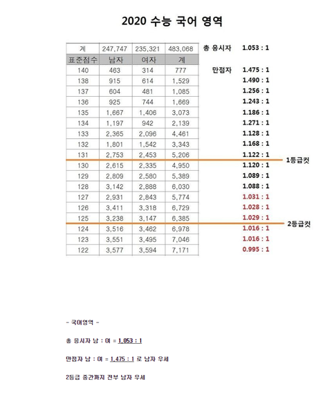 예를 들면 총 응시자 비율이 2:1인데 1등급 비율이 1.5:1 이 나오면 여자우세, 2.5:1이 나오면 남자 우세로 표시한다는 거임.