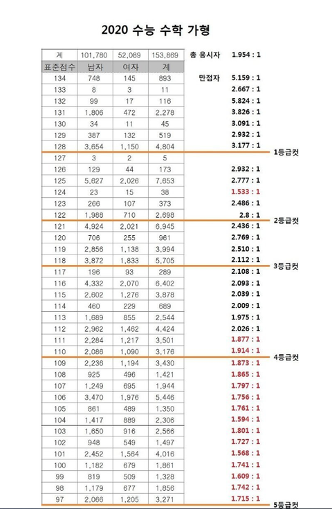 2020 수학 가형 = 만점자부터 4등급 커트라인 근처까지 남자 우세