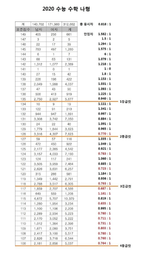 이래도 이해 못할까봐 설명 더 하자면 만약 총 응시자 비율이 3:1 인데 1등급 비율이 4:1이면 남자는 약 상위 4.3%가 1등급을 받는 데, 여자는 상위 3.2%가 1등급을 받는다는 거임. 당연히 남자가 더 잘한다는 거겠지?( 계산 편하게 하려고 예는 이렇게 들었지만 실제로는 1.6%대 6.5%나와서 4배넘게 차이나는 과목들도 많고 대부분 1.5~3배 차이난다.)